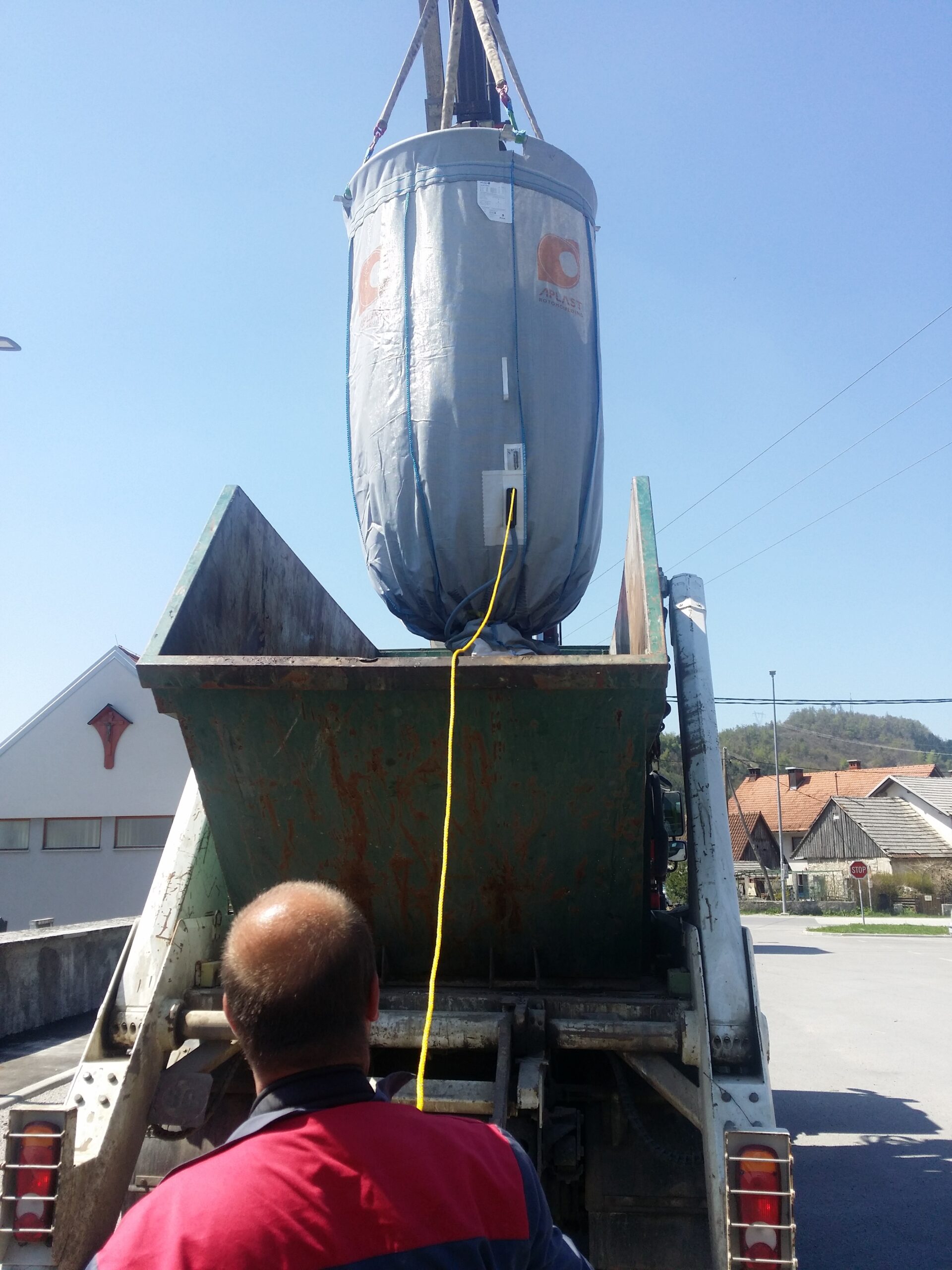 Gre za enostavnejšo izvedbo s fiksnim pokrovom in enojnim dvižnim prijemalom, ki omogoča hitro in učinkovito praznjenje z minimalnim časom manipulacije.